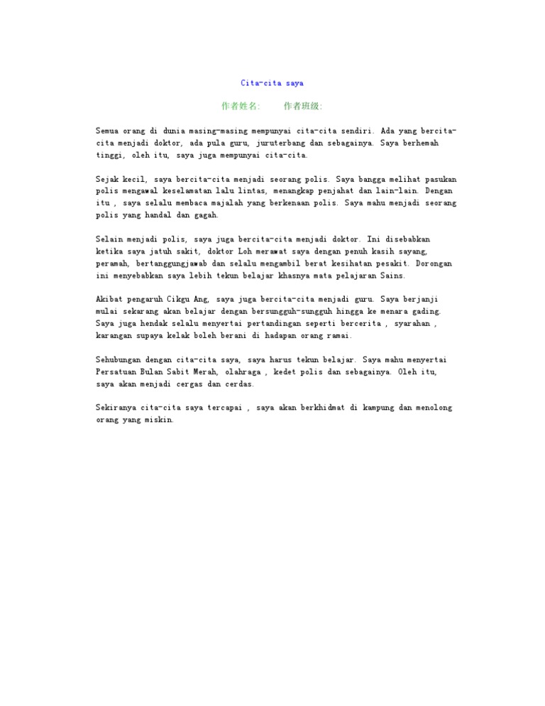 Saya punya keinginan bahwa aku yakin bahwa semua cita-citaku harus terwujud. Contoh karangan tentang cita cita. Karangan Upsr cita-cita Doktor Kebanyakan orang ada cita-cita.